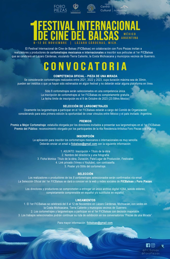 El Festival Internacional de Cine de Balsas (FICBalsas) en colaboración con Foro Piezas invitan a realizadores y productores de cortometrajes mexicanos e internacionales a inscribir sus películas al 1er FICBalsas que se celebrará en Lázaro Cárdenas, viculando Tierra Caliente, la Costa Michoacana y municipios vecinos de Guerrero.